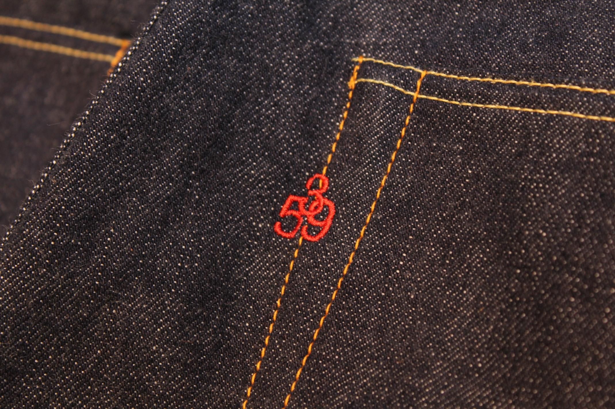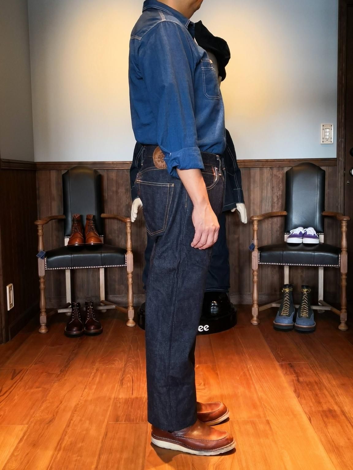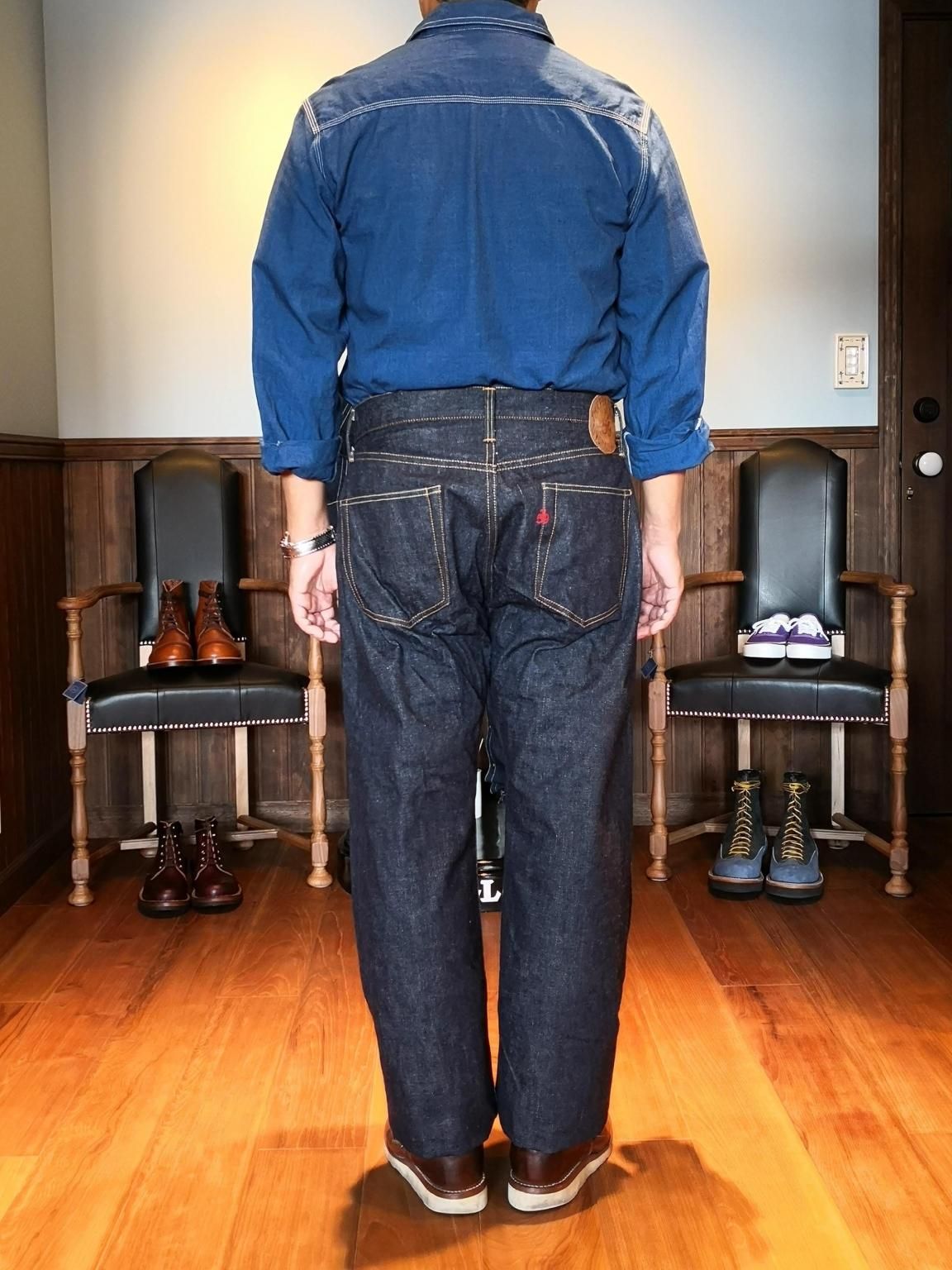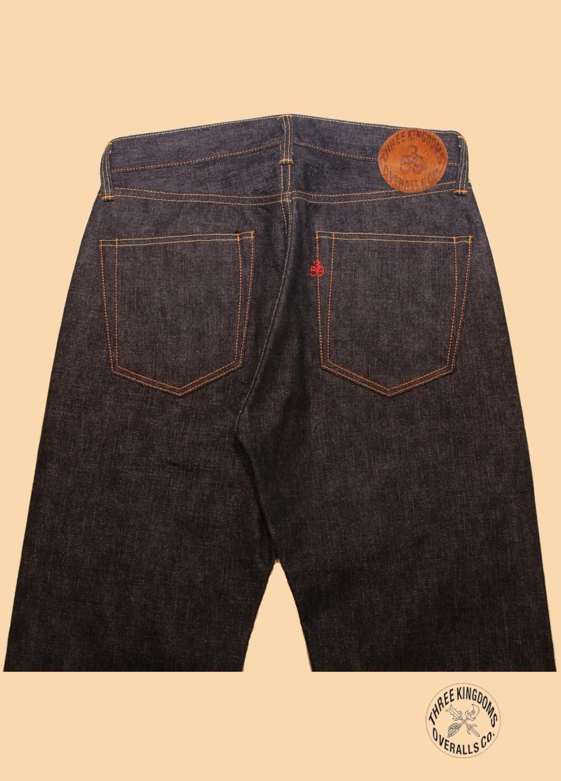 Details 1.16oz VINTAGE FACE セルビッチデニム 旧式力織機(IM式)弱ローテンション織り 生機 岡山製造 2.100%アメリカコットン(ブレンド)ムラ糸使用 3.100%ピュアインディゴ ロープ染色 濃色 芯白 4.クラシックストレートシルエット 5.ボタンフライ 6.オリジナル THREE KINGDOMS OVERALLS 真鍮トップボタン 二本爪仕様(ツープロング仕様)首高タイプ 黒色+銅色二重メッキ 7.真鍮プレーンドーナツボタン ブラウンメッキ 二本爪仕様(ツープロング仕様)首高タイプ 8.Standard 359 Series専用オリジナル丸型ヘア・オン・ハイド革パッチ(ブラウン) 359焼印 牛革 9.11.4mm打ち抜きタイプ無垢銅リベット 10.銅製隠しリベット 11.バックポケット359赤刺繍 バックステッチなし 12.バックポケット全面当て布付き補強 13.フロントポケット口パイピング補強 14.コインポケットセルビッチ使用 15.ウエストバンドエンド部Vステッチ(三角ステッチ) 『コ』の字ステッチ 16.クロッチリベット部分カン留め補強 17.裾チェーンステッチ 18.ベルトループ芯地無し山高仕様 19.バックポケット口芯地無し山高仕様 20.岡山県内にあるデニム専門老舗縫製工場によるビンテージ縫製 21.THREE KINGDOMS OVERALLS 朱子織ブランドネーム付きスレーキ 22.Standard 359 Series専用フラッシャー Size : 28,29,30,31,32,33,34,36 Price : ¥22,800+tax COTTON 100% MADE IN JAPAN